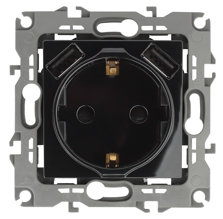Розетка с заземлением с USB со шторками серии Эра 12 скрытой установки механизм цвет чёрный 12-4109-06. Номинальные характеристики 16А 250В/3А-5В . Сделана из поликарбоната. Монтаж в подрозетник производится и на лапки, и на винты. Рамки приобретаются отдельно. Рамки Эра 12: 1 пост 12-5001-хх, 2 поста 12-5002-хх, 3 поста 12-5003-хх, 4 поста 12-5004-хх, 5 постов 12-5005-хх. Рамки Эра 12 Сатин: 1 пост 12-5101-хх, 2 поста 12-5102-хх, 3 поста 12-5103-хх, 4 поста 12-5104-хх, 5 постов - 12-5105-хх (хх - код цвета: 01-белый, 02-слоновая кость, 03-алюминий, 04-шампань, 05-антрацит, 06-чёрный, 07-ольха(белёный дуб-сатин), 08-вишня, 09-дуб, 10-венге, 11-сосна, 21-жёлтый, 22-оранжевый, 23-красный, 24-охра, 25-бордо, 26-лайм, 27-зелёный, 28-голубой, 29-синий).